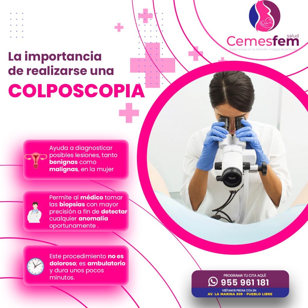 El colposcopio no se inserta en el cuerpo de la mujer y el examen no es doloroso. Se puede realizar en el consultorio y no tiene efectos secundarios. También puede realizarse en mujeres embarazadas.